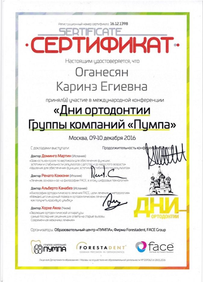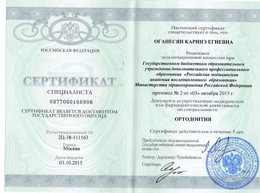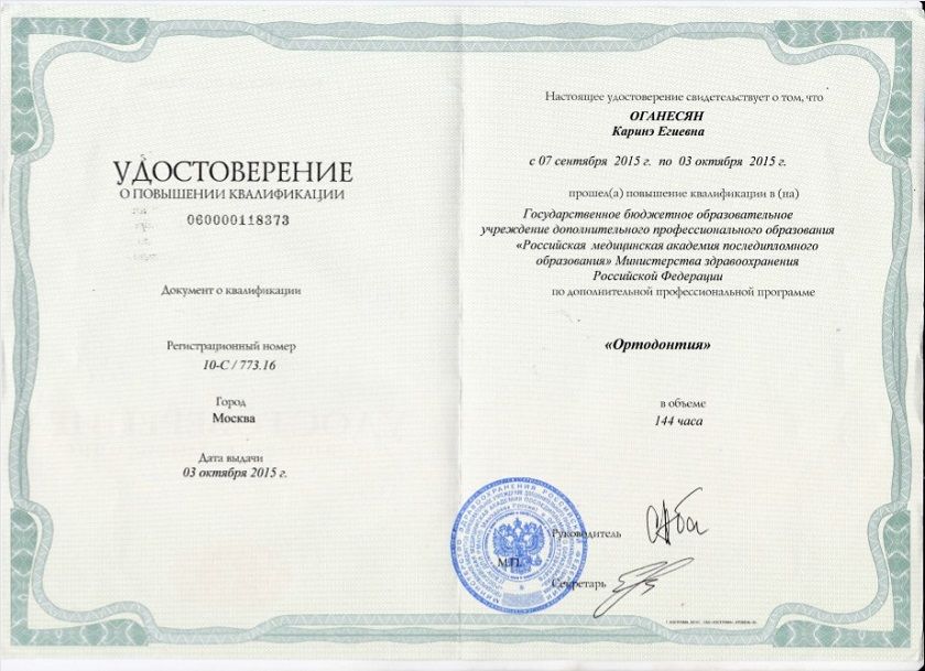 - 2015 — РМАПО переподготовка по специальности “ Ортодонтия “
