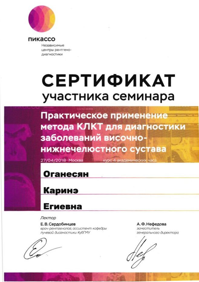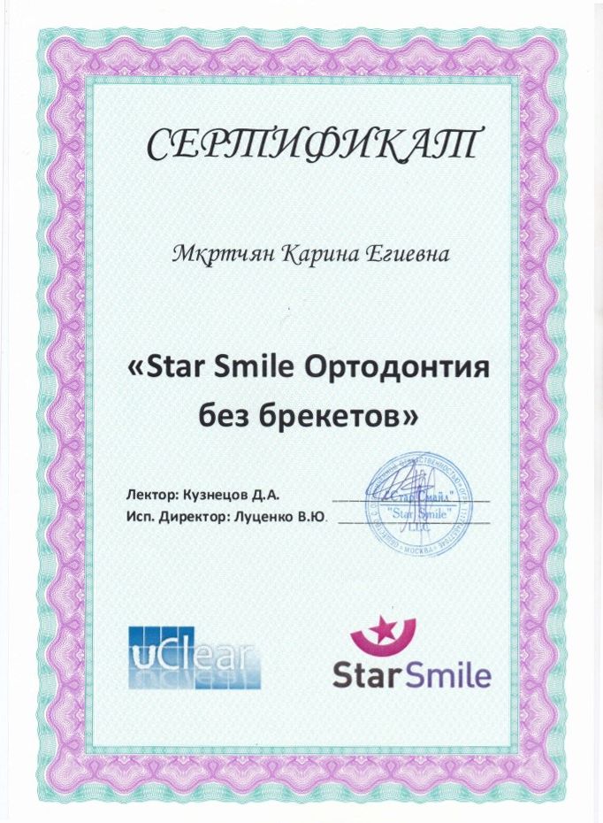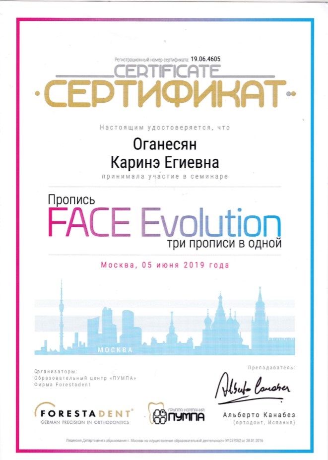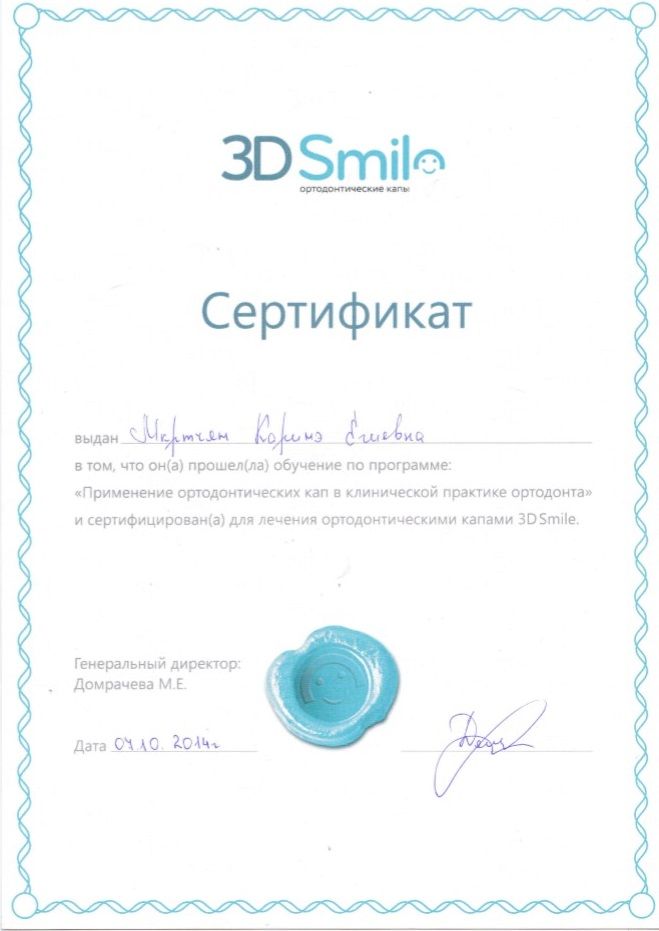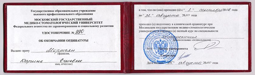 - 2008-2010 — МГМСУ им. А. И. Евдокимова, ординатура по специальности “ Ортодонтия “