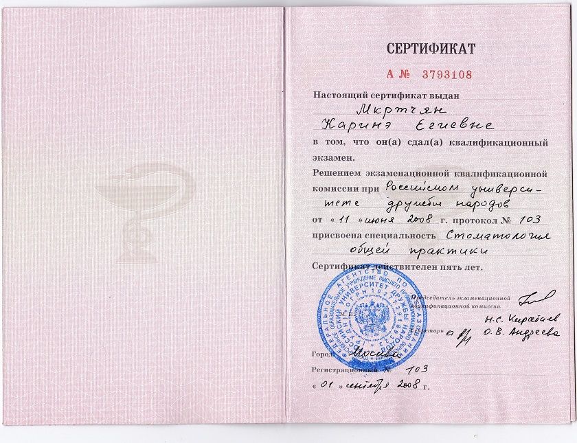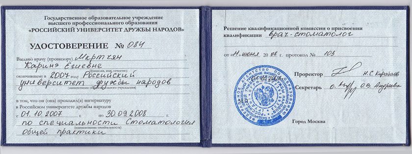 - 2007-2008 — РУДН, интернатура по общей стоматологи