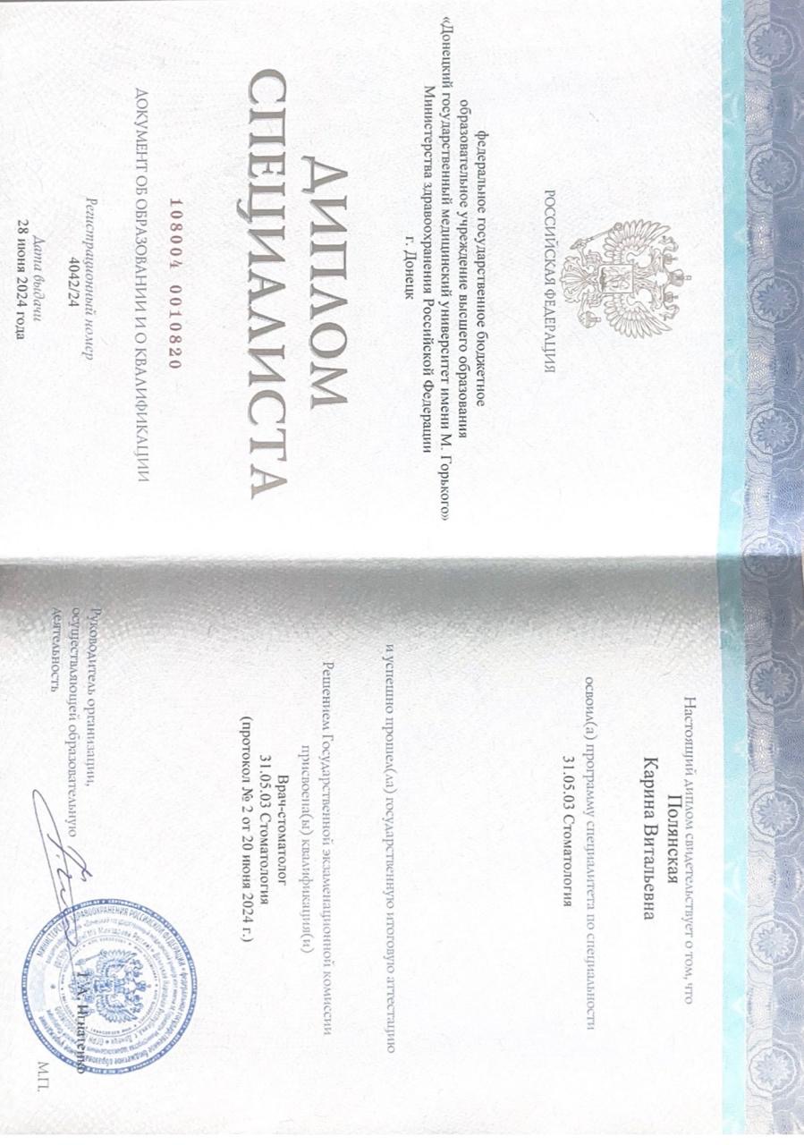 - 2024 — «Донецкий государственный медицинский университет имени М. Горького» Министерства здравоохранения Российской Федерации Специальность - стоматология