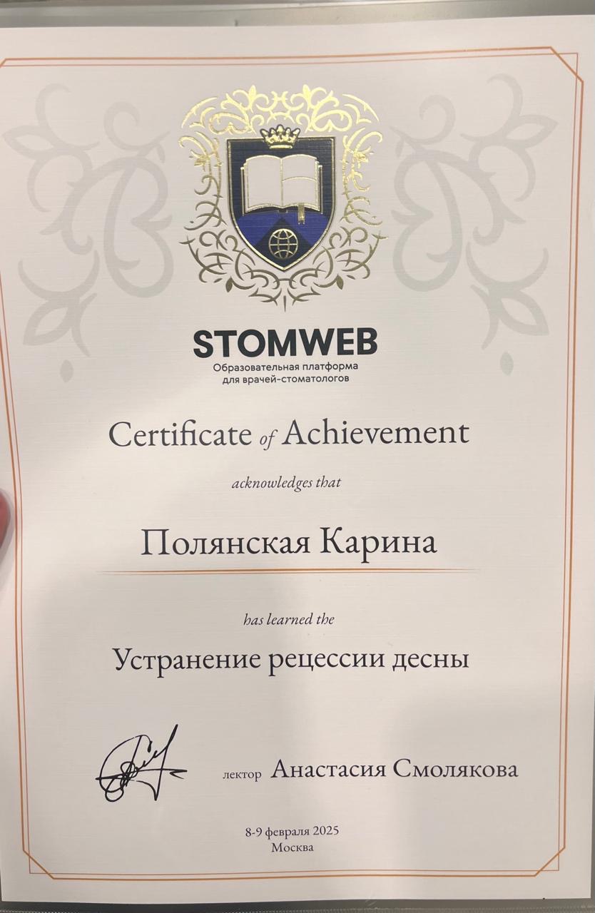 Карина Витальевна активно работает над повышением своей квалификации, посещая курсы и конференции, посвященные актуальным вопросам стоматологии и пародонтологии. Это позволяет ей внедрять современные методы и технологии в свою работу.