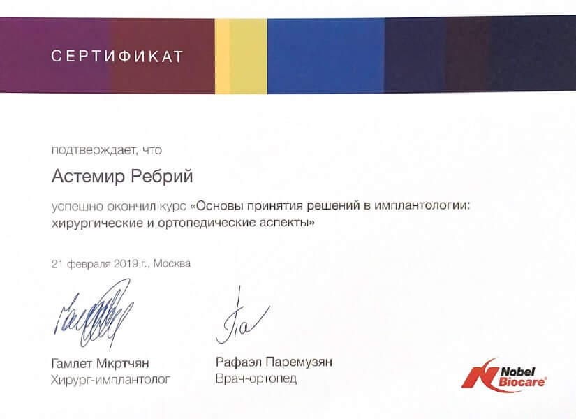 - 2019 — «Основы принятия решения в имплантологии: хирургические и ортопедические аспекты» Nobel Biocare