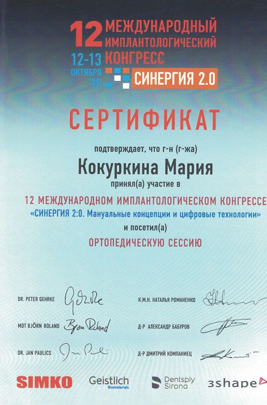 - 2019 — 12 Международный имплантологический конгресс. Ортопедическая сессия