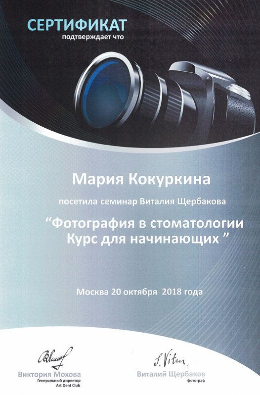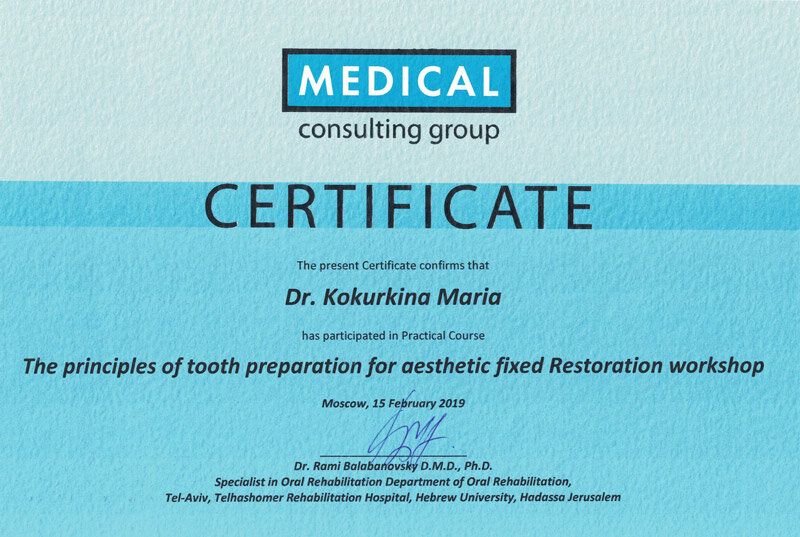 - 2019 — Курс Виталия Щербакова «Фотография в стоматологии» октябрь 2018 Теоретический и практический курс Рами Балабановски «Препарирование зубов под эстетические цельнокерамические (all-ceramic), металлокерамические коронки и керамические виниры на фантомах»