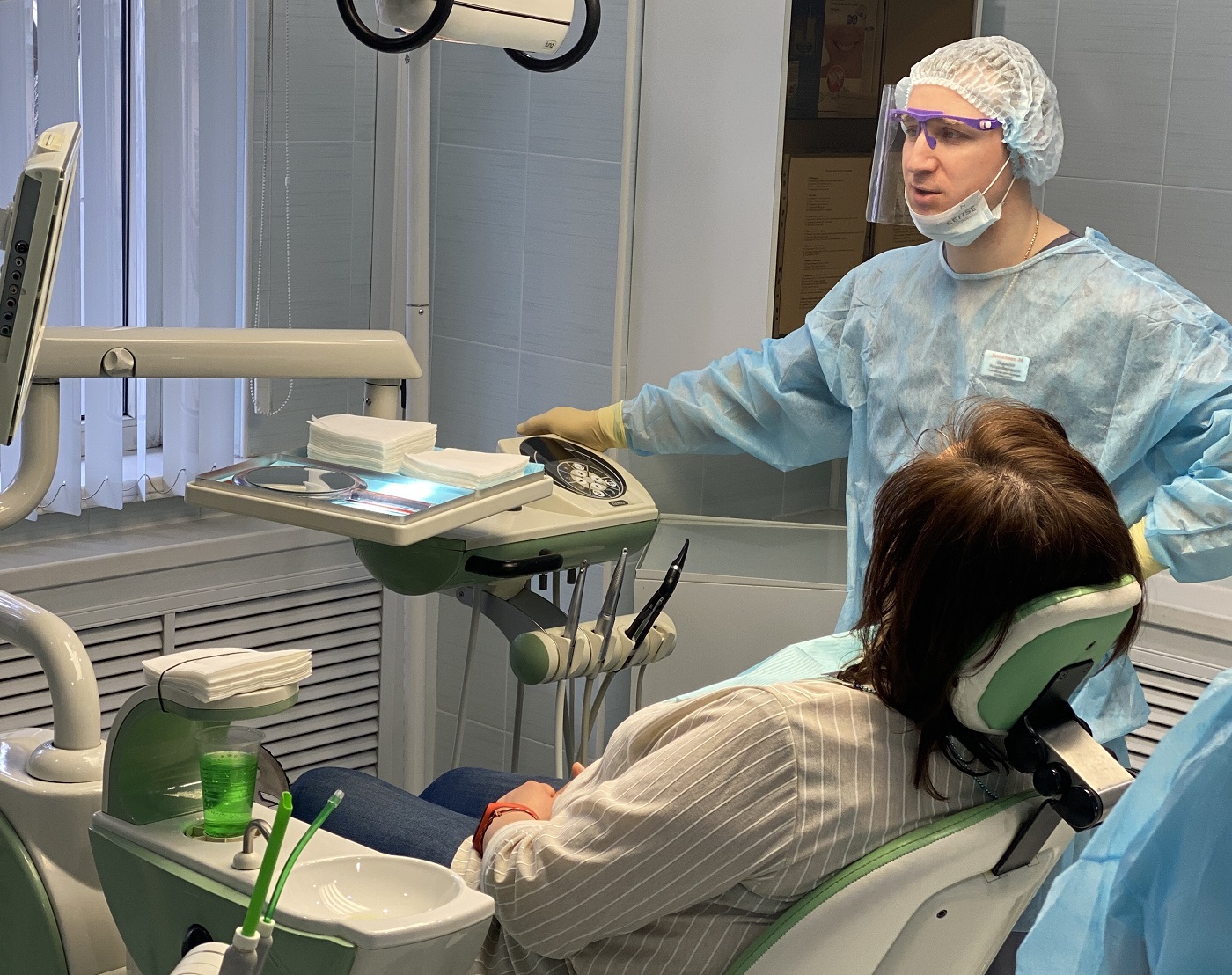 Стоматолог оценивает состояние полости рта, слизистых оболочек, выявляет сопутствующие заболевания (например, заболевания десен), аллергии, хронические болезни и принимаемые препараты
